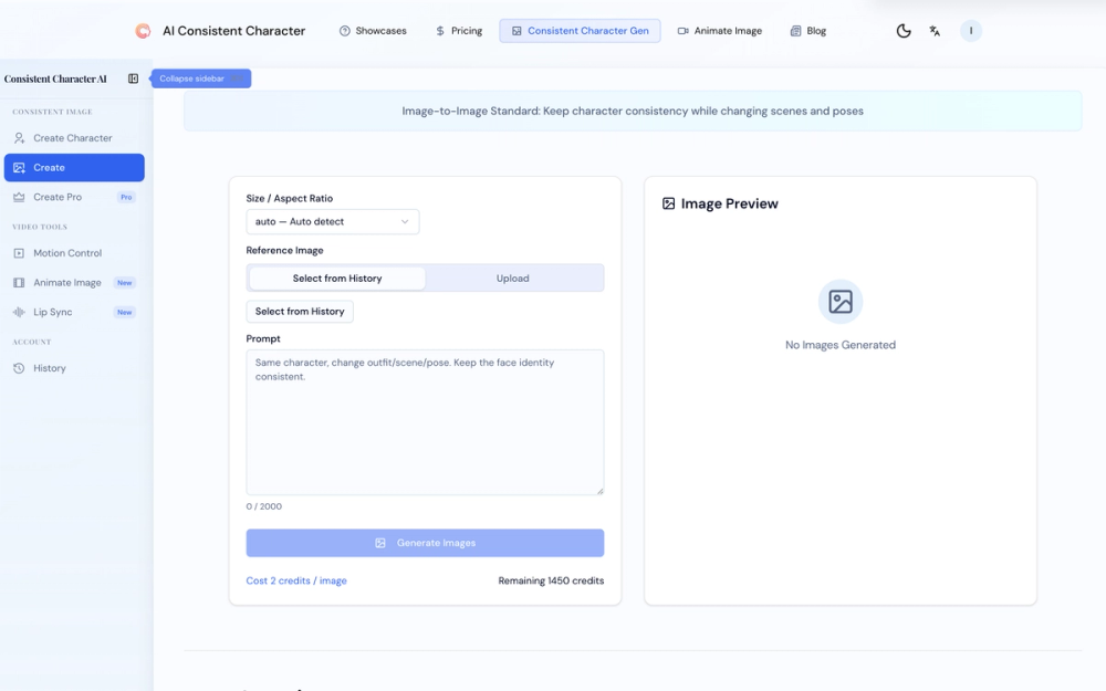Identity-locked generation — the same character, every single time Works from one photo or a text-only character description Pose, outfit, and scene changes without breaking facial consistency Multi-character compositions with distinct, stable identities Flexible art styles — switch between anime, 3D, and photorealistic without losing the character Built-in Character Bank for cast management and quick recall Video mode and API for animation workflows and developer integration