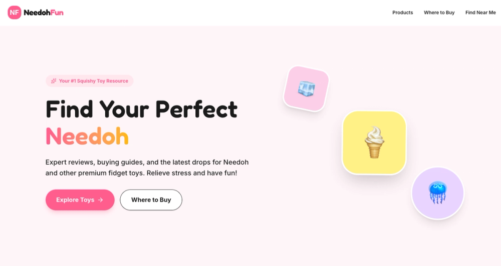 - Needoh | Ultimate Nee-Doh Guide & Reviews Needoh Fun Products Where to Buy Find Near Me FAQ Your #1 Squishy Toy Resource Find Your Perfect Needoh (Nee Doh) Expert reviews, buying guides, and the latest drops for Needoh and other premium fidget toys. Relieve stress and have fun! Explore Toys Where to Buy 🧊 🪼 🍦 What Makes Needoh Special? Needoh is a line of stress relief toys by Schylling... honestly, the lineup has gotten huge. From the classic ball to cosmic cubes and jellyfish, these toys are designed to provide the ultimate sensory experience. Safe & Non-Toxic BPA-free materials that meet US and EU safety standards. Safe for ages 3 and up. Stress Relief Occupational therapists recommend them for anxiety, ADHD focus, and sensory needs. Fun for Everyone From kids to adults, there's a Needoh for every squisher. The lineup has gotten huge and there's something for everyone. Featured Needoh Hand-picked favorites from our experts. View All Products The Original Needoh Nice Cube The viral sensation that started it all. Dense, doughy, and incredibly satisfying. Experience the ultimate slow-rise squish with the original Nice Cube. 4.7 $11.99 Most Unique Needoh Jellyfish Meet the most unique member of the Needoh family. Translucent, shimmering, and incredibly soft, the Jellyfish offers a different kind of sensory satisfaction. 4.5 $6.63 Palm Sized Needoh Gumdrop A fun, teardrop-shaped fidget that fits perfectly in your hand. Vibrant colors and classic Needoh squish make the Gumdrop a desk favorite. 4.4 $16.50 TikTok Viral Needoh Ice Cream An ice cream cone you squeeze instead of eat. Same Needoh squish compound, just in a fun shape that kids go crazy for. Perfect for gifts and desk decoration. 4.6 $9.99 Browse Products See every Needoh fidget toy we have tested, with ratings and honest takes. Browse Products 🎯 Where to Buy Find the best online retailers and deals for authentic products. Read Guide 🛒 Find Near Me Use our tips to locate stock in local physical stores before you drive. Local Guide 🏪 What is Needoh? (Nee Doh) Originally created by Schylling, Nee-Doh (often spelled as Nee Doh ) is the world's most popular sensory squeeze toy. Unlike traditional stress balls, every Needoh is filled with a unique, super-soft, dough-like compound that provides incredible tactile feedback. Whether you're looking for the firm satisfaction of a Nice Cube , the visual calm of a Jellyfish , or the classic squish of a Gumdrop , Needoh offers a sensory experience that helps relieve stress, improve focus, and provide endless fun for kids and adults alike. How to Choose the Right Needoh There are a lot of Needoh products now, and they are all different enough that picking one can be confusing. The Nice Cube and Jellyfish are completely different experiences. The Gumdrop and Dream Drop look similar but feel nothing alike. We have put together quick guides to help you figure out which shape, size, and texture actually fits what you need. For ADHD & Focus Best high-feedback squishies for constant fidgeting. Visual Calming Slow-rise and mesh-based toys for visual relaxation. Kids & Gifts Durable and colorful options perfect for the little ones. Collectors Rare and limited edition drops you don't want to miss. Needoh FAQ Everything you need to know about the world's most satisfying squish. What is a Needoh? NeeDoh is more than just a stress ball; it's a sensory experience. Created by Schylling, it's a line of squishy toys filled with a unique, non-toxic, dough-like compound that always returns to its original shape, no matter how much you squeeze, pull, or smush it. Are Needoh toys safe for children? Which Needoh is best for anxiety and stress relief? Where can I buy authentic Needoh products? How long do Needoh toys last? Needoh Fun The ultimate resource for Needoh enthusiasts. 100% independent reviews, real testing, and the best deals. Products Nice Cube Review