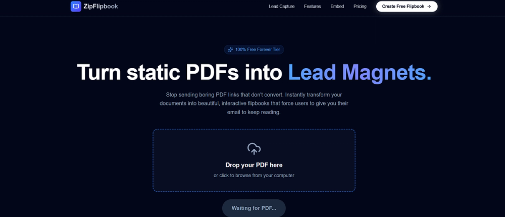 ZipFlipbook fixes the "black hole" of PDF lead magnets and client deliverables. It is a cloud-based web app that transforms static, clunky PDFs into interactive, fast-loading digital flipbooks. Designed for creators, marketers, and agencies, it replaces heavy file downloads with seamless website embeds. Users get a premium, Kindle-like reading experience on any device, while creators get access to page-by-page reader analytics and built-in "soft-gating" to capture emails directly inside the document.